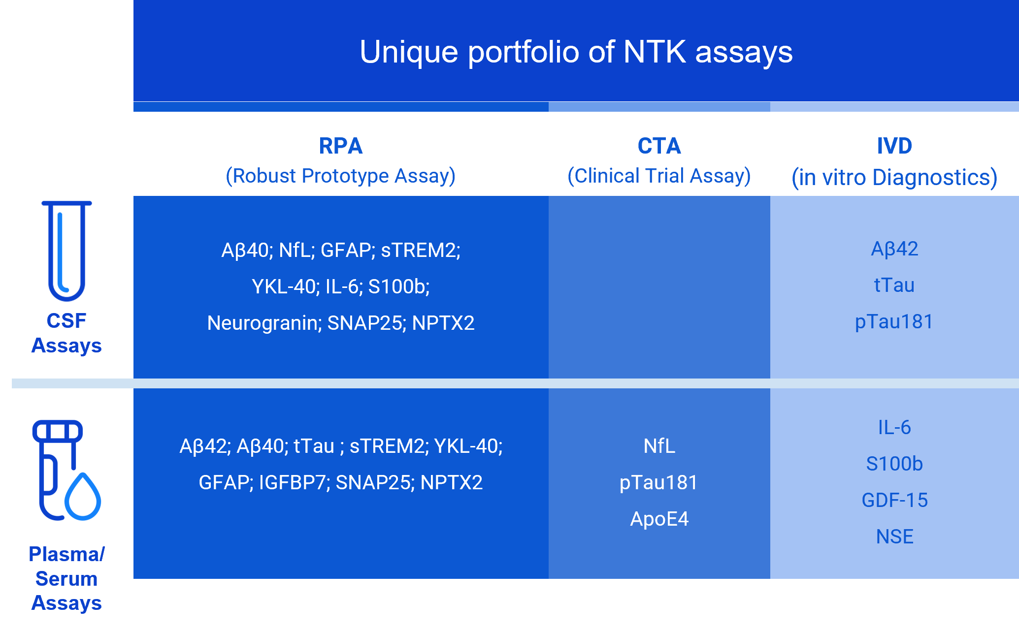 The NTK offers a portfolio of exploratory prototype assays designed to generate high quality, comparable clinical biomarker data across academic and industry cohorts. The NTK assays can be run on the fully automated Cobas® platform in four NTK qualified labs. This ensures that high quality, reproducible data can be compared with multiple datasets - maximizing how results can be interpreted. This clarifies the clinical utility of biomarkers, how they can be used in clinical trials, and ultimately which biomarkers warrant further development for use in routine clinical practice.