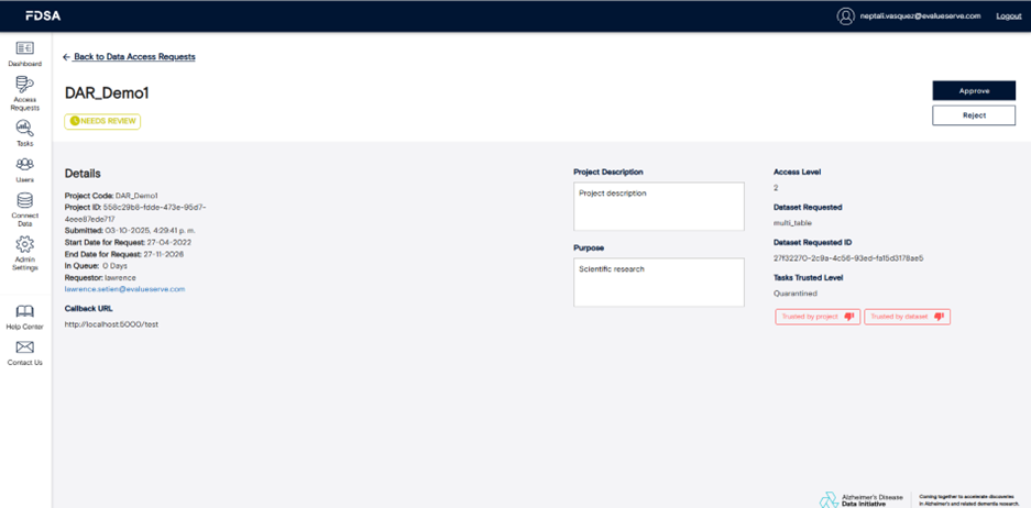 In the Data Access Requests section, you’ll find detailed information about all submitted DARs from researchers. Each entry includes key details such as requester information, datasets requested, and approval status. To view a specific request, click on its name to open the detailed view, where you can either approve or reject the DAR.
