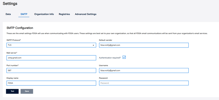 The SMTP tab lets you test and update your outgoing email settings. Proper configuration ensures that system notifications, alerts, and password reset messages are sent reliably to users.