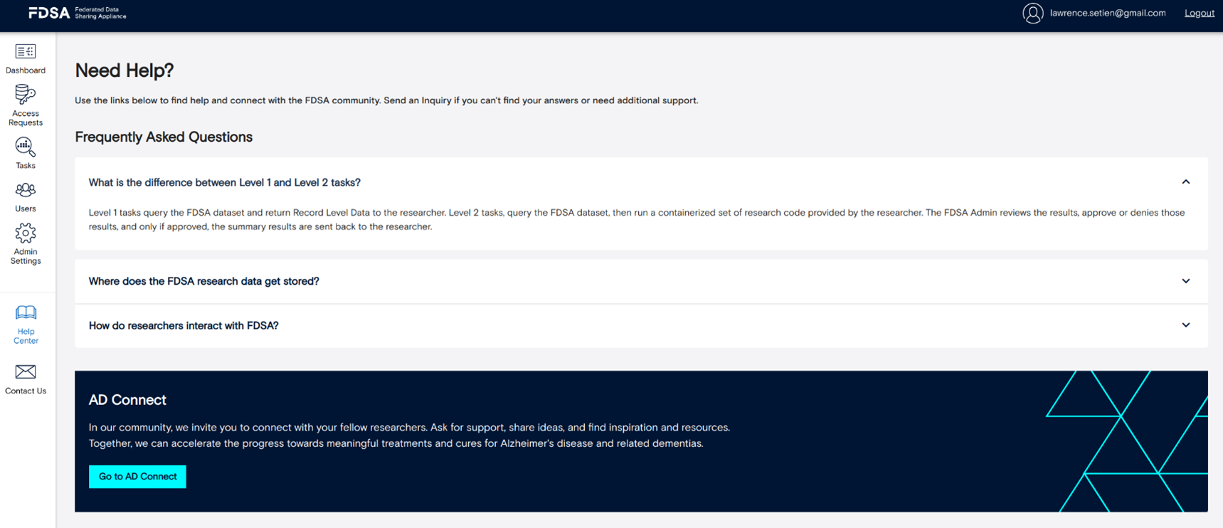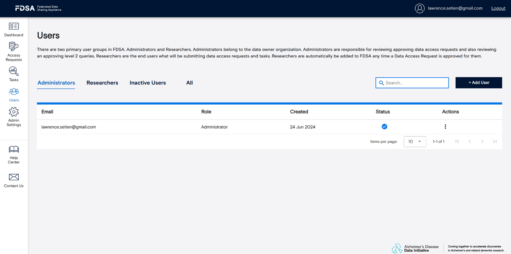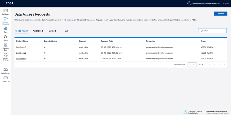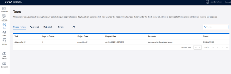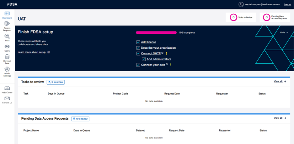 After logging in, you’ll land on the Overview page. This section gives administrators a quick snapshot of the FDSA environment, including the status of pending Data Access Requests (DARs) and tasks awaiting review. It’s designed to provide at-a-glance visibility into system activity so you can prioritize what needs attention right away.