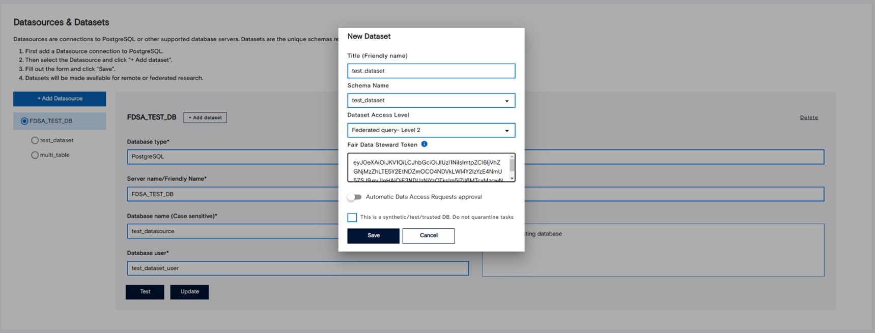FDSA includes a default test data source named FDSA_TEST_DB. Before adding new data sources, review the setup instructions for creating a datasource database. Once ready, add your new datasource in FDSA and select it from the list. You can then add datasets to it by clicking “Add Dataset.” The system will guide you through generating a Fair Data Steward Token, which links the dataset securely to your instance. After completing the form, click “Save” to finish.