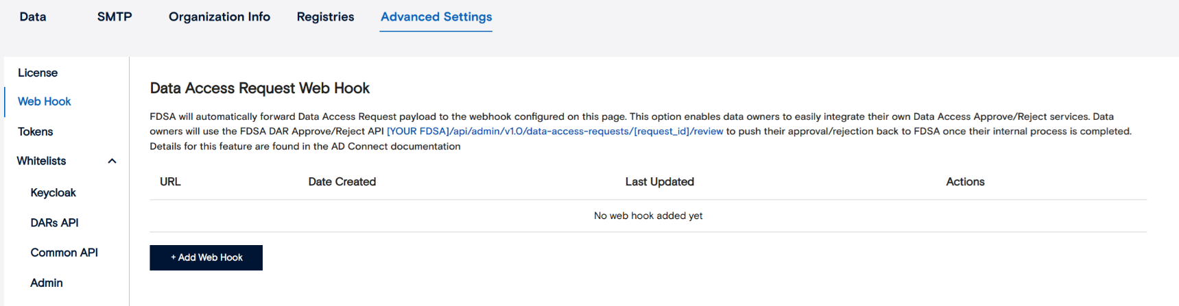 This section allows you to configure webhooks for automatic updates and notifications related to Data Access Requests. Webhooks can help streamline communication between systems and reduce manual follow-up.