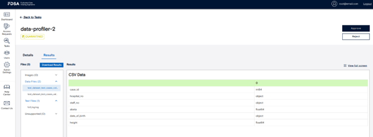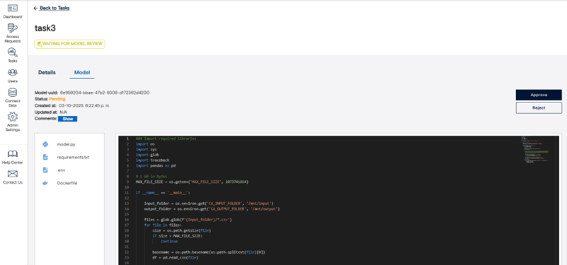 In the tasks section, remote queries that have been associated with the respective FDSA instance are grouped by status and listed. Clicking a task name opens its detailed view, where you can examine metadata, submission parameters, and results. You can view processed output under the “Results” tab. If model review is enabled for the dataset, a third tab titled “Model” will appear, allowing you to inspect the code used in the task before or during quarantine review. This helps maintain transparency and control over models executed within the system.