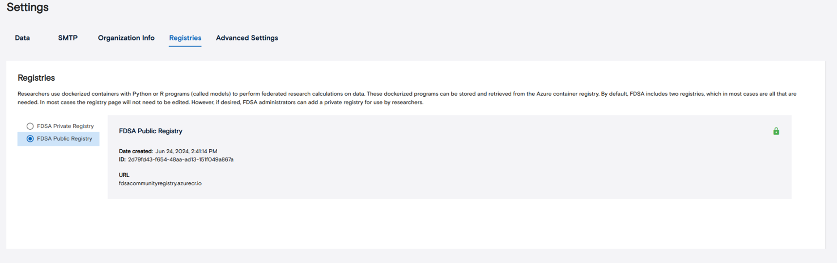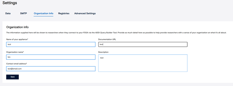 This tab stores details about your organization, such as name, contact information, and other identifying details that researchers will see. Keeping this information up to date helps users easily recognize your FDSA instance.