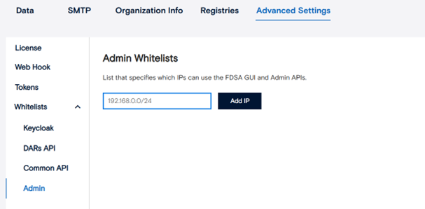 The Whitelist section allows administrators to control which IP addresses are permitted to access different parts of FDSA. By default, all IPs are allowed. However, once you add specific IPs, only those addresses will have access. Use this feature carefully — entering the wrong IPs can block valid users from connecting to the system.