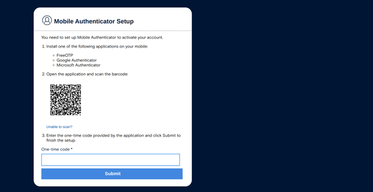 After creating your administrator account, sign in using your credentials. You’ll then be prompted to connect a Multi-Factor Authentication (MFA) app, such as Google Authenticator or Authy, to add an extra layer of security. Scan the QR code on your screen using the app and enter the verification code it generates to complete the setup.
