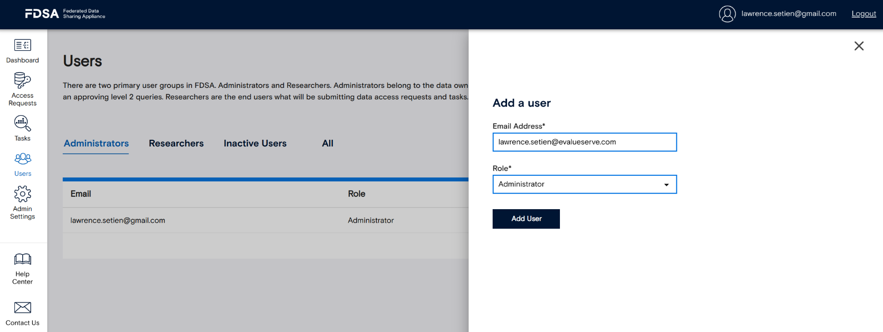 The Users section is where you can manage who has access to your FDSA environment. To add a new user, open the Users tab and click “Add User.” Enter their email address and assign the appropriate role before confirming. The system will automatically send an email with temporary login credentials to the new user. When they log in for the first time, they’ll be required to set up MFA and create a new password.