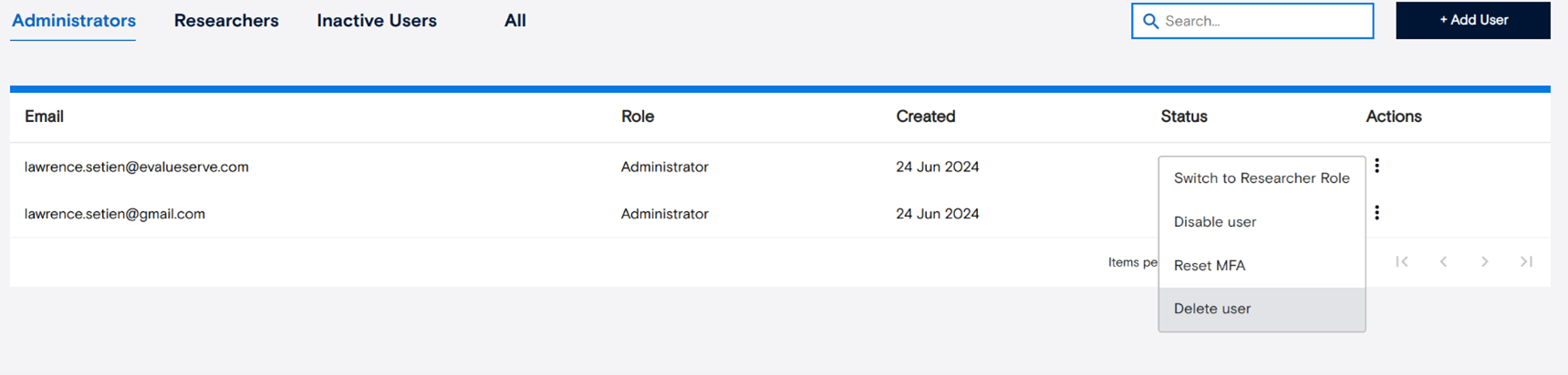 Administrators can manage users under the “Actions” menu, where they can change roles, reset MFA, or disable or delete accounts as needed. This section ensures that only authorized users have access and that user roles remain current and secure.