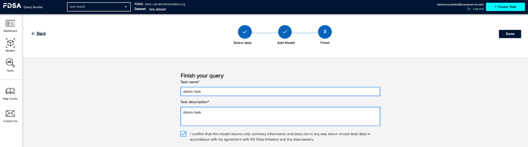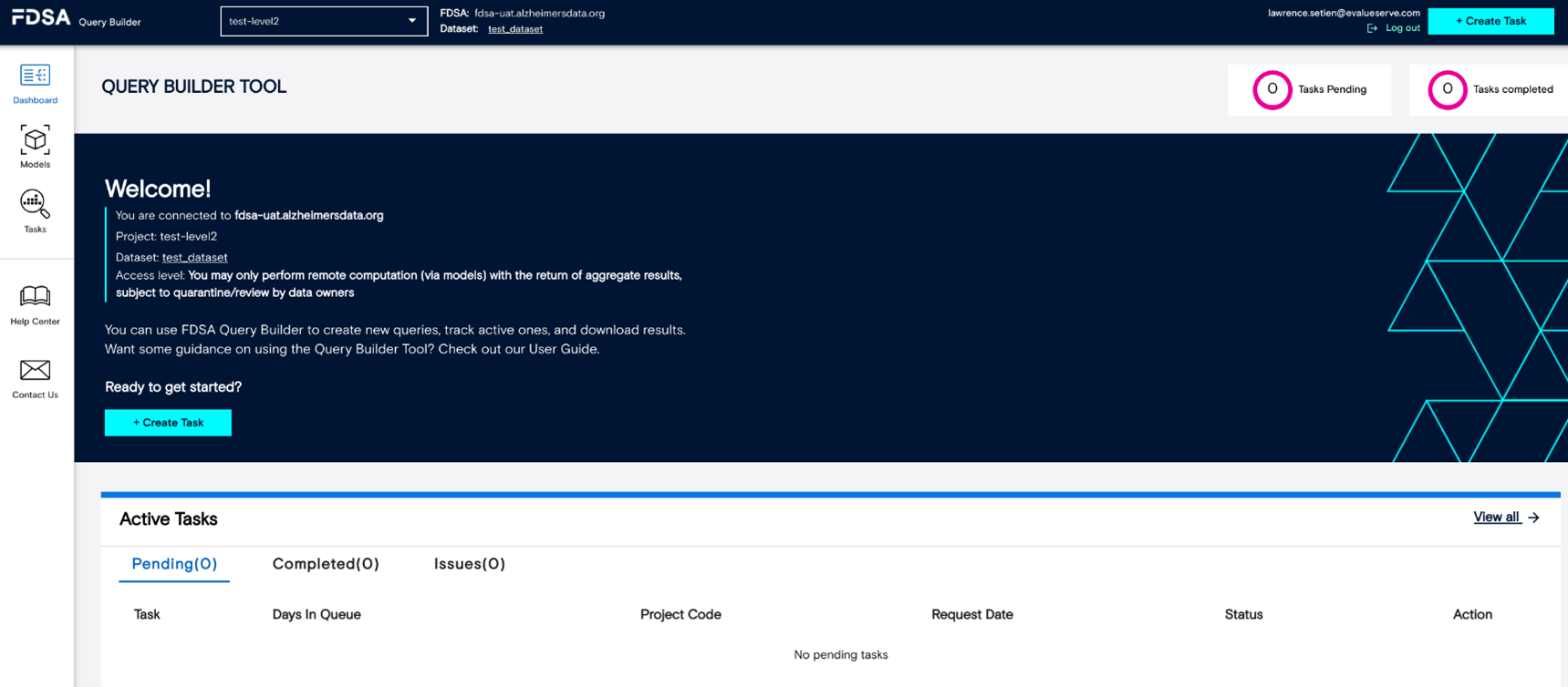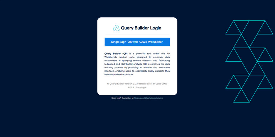 The Query Builder lets you query remote data and run remote processing on approved datasets in a partner organization’s environment. After your Data Access Request (DAR) is approved, you can sign in via AD Workbench, connect to an FDSA instance, build a remote query task, and submit it for administrator review.