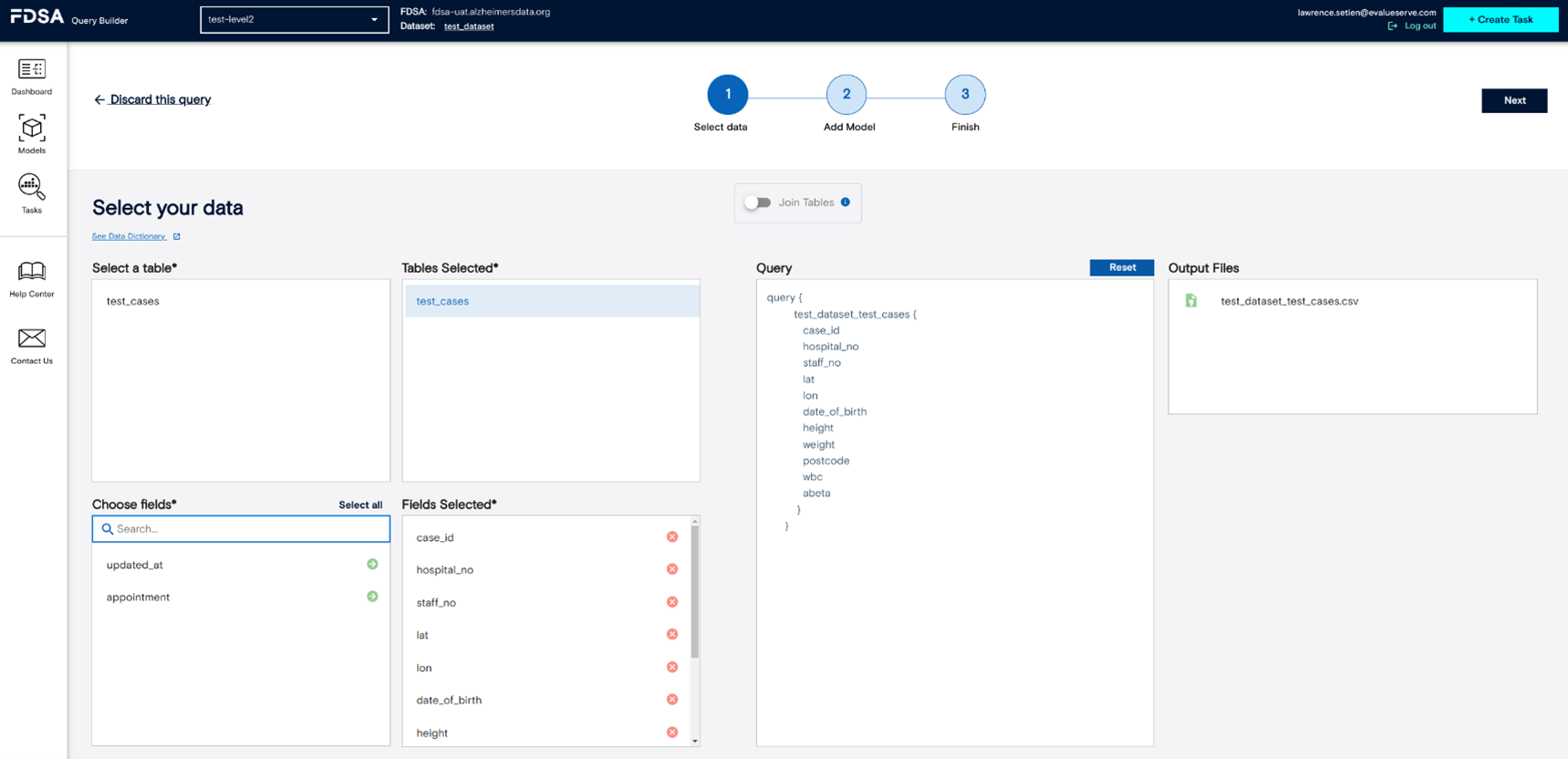 Once your Data Access Request (DAR) is approved, you can use the Query Builder to run remote queries against approved datasets. All analysis happens inside the partner organization’s environment; only approved results are returned to your protected workspace.