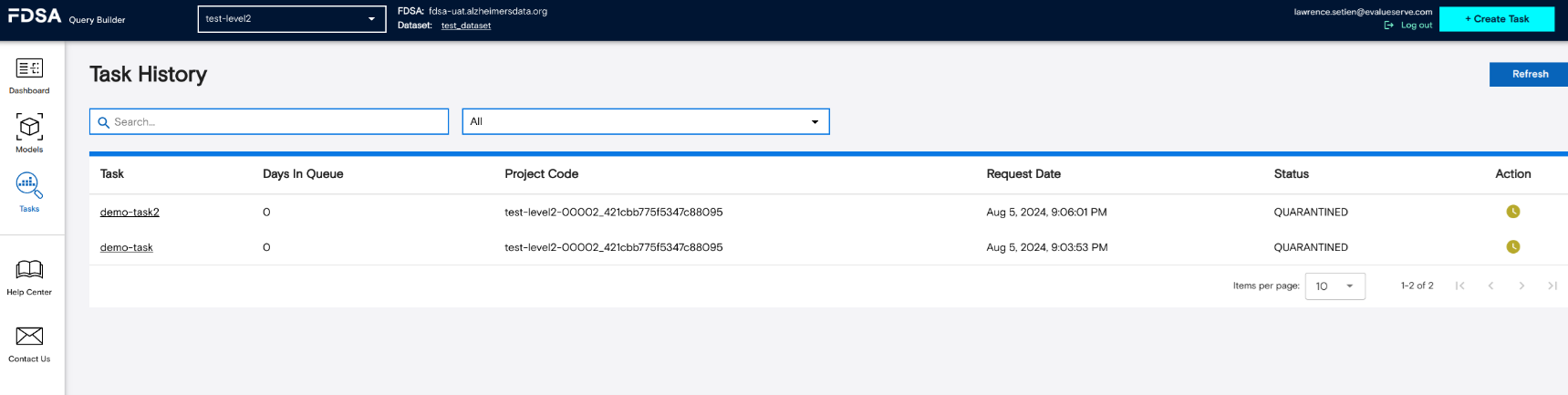 - See the status of your existing tasks (e.g., quarantined, approved, completed).