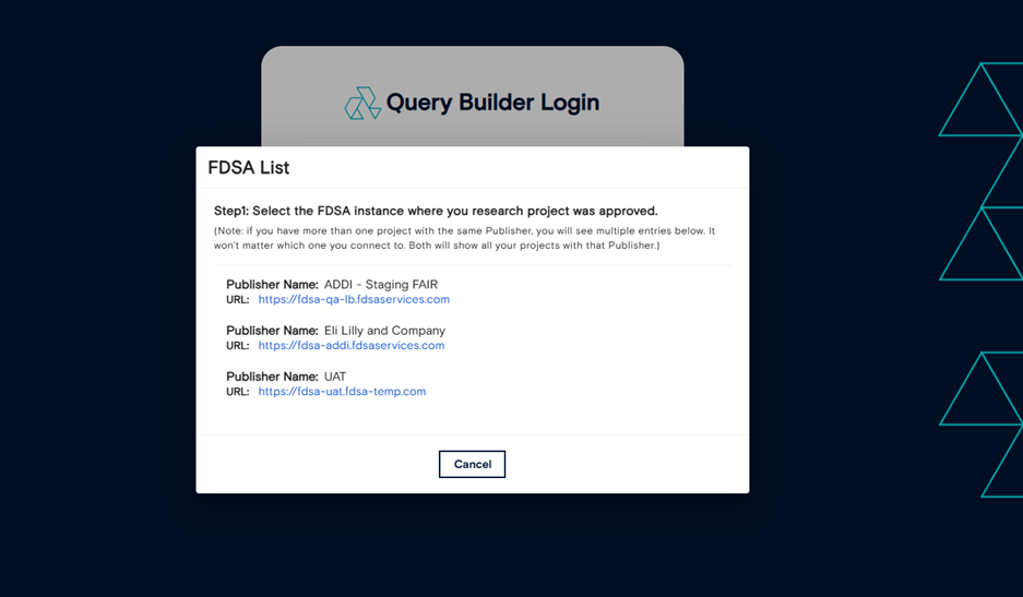 - If you have access to multiple FDSA instances, select which FDSA you want to connect to.