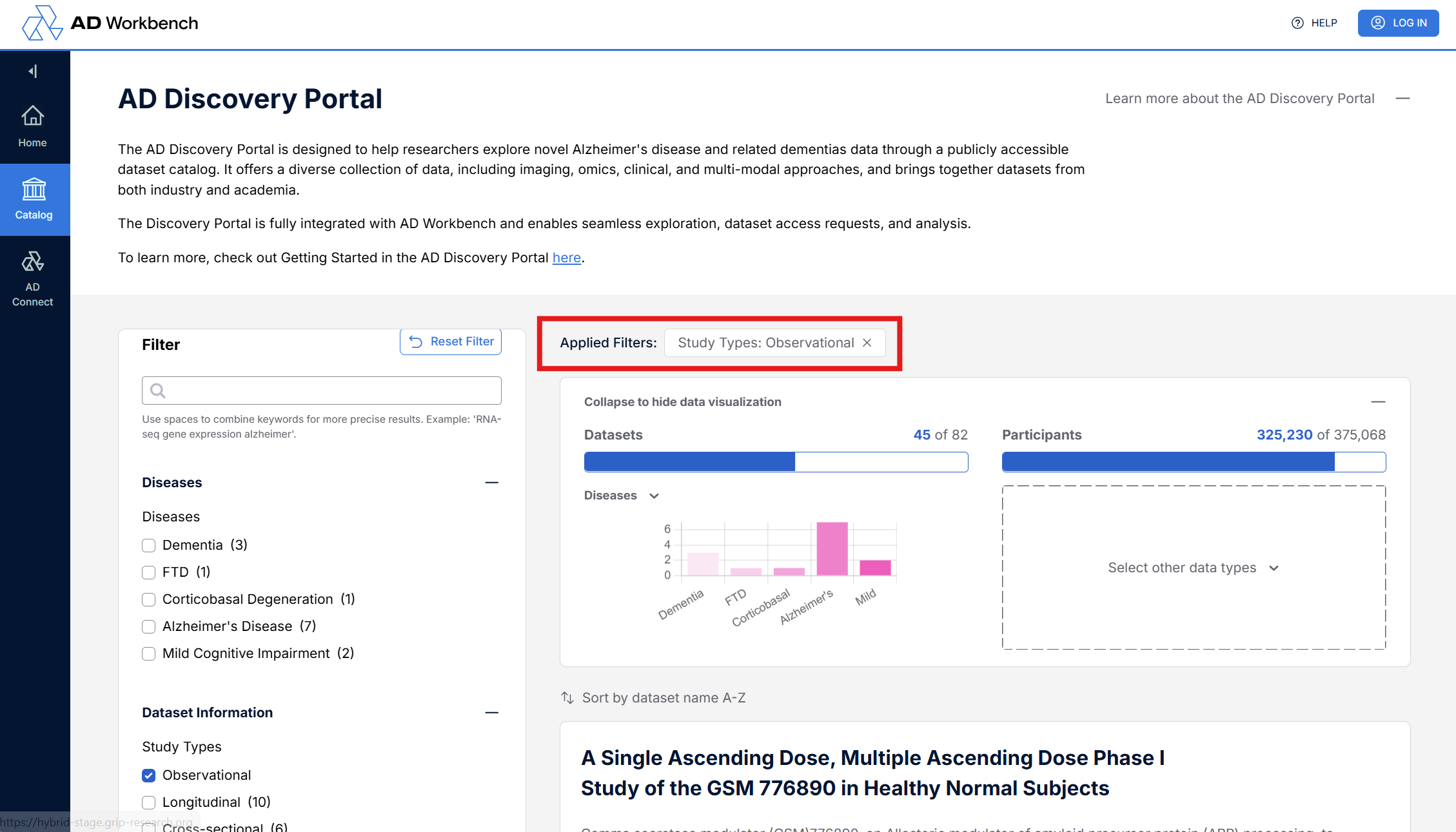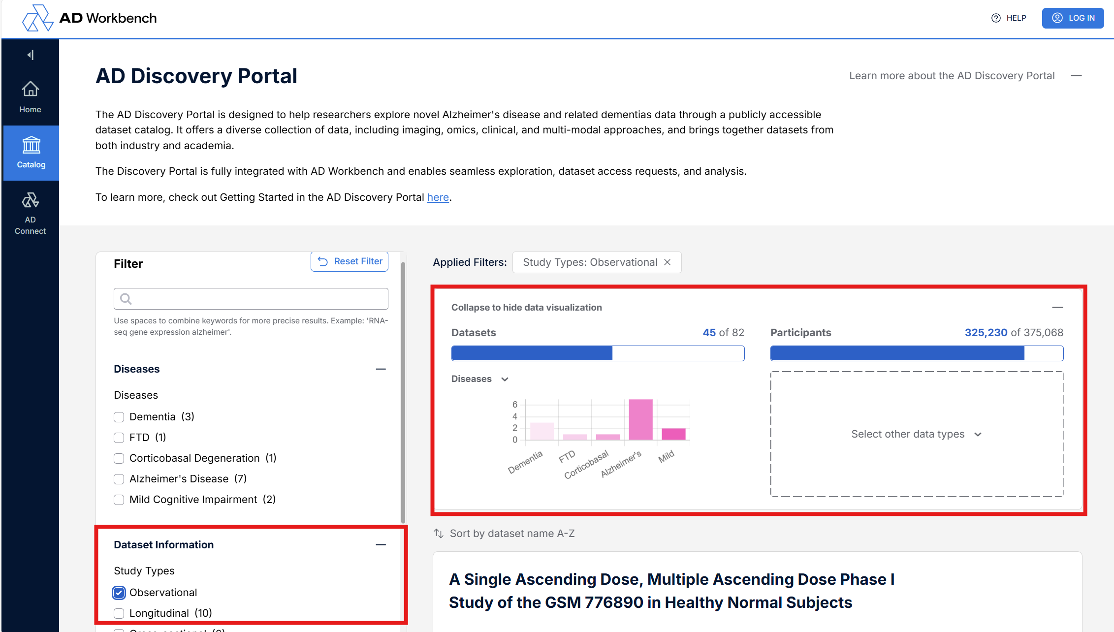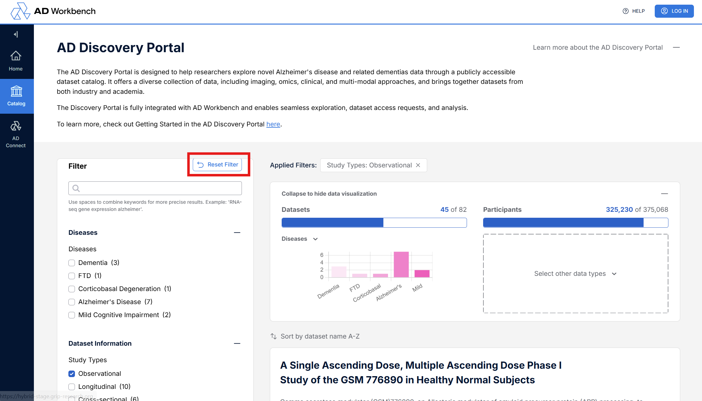 Return to the dataset list using either the back button on the browser or clicking the “Back to discovery portal” link in the top of the left panel.