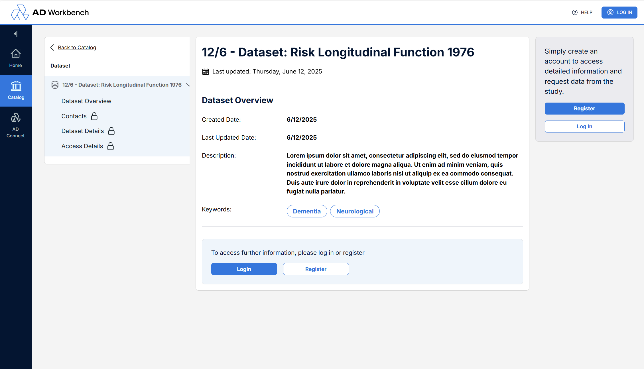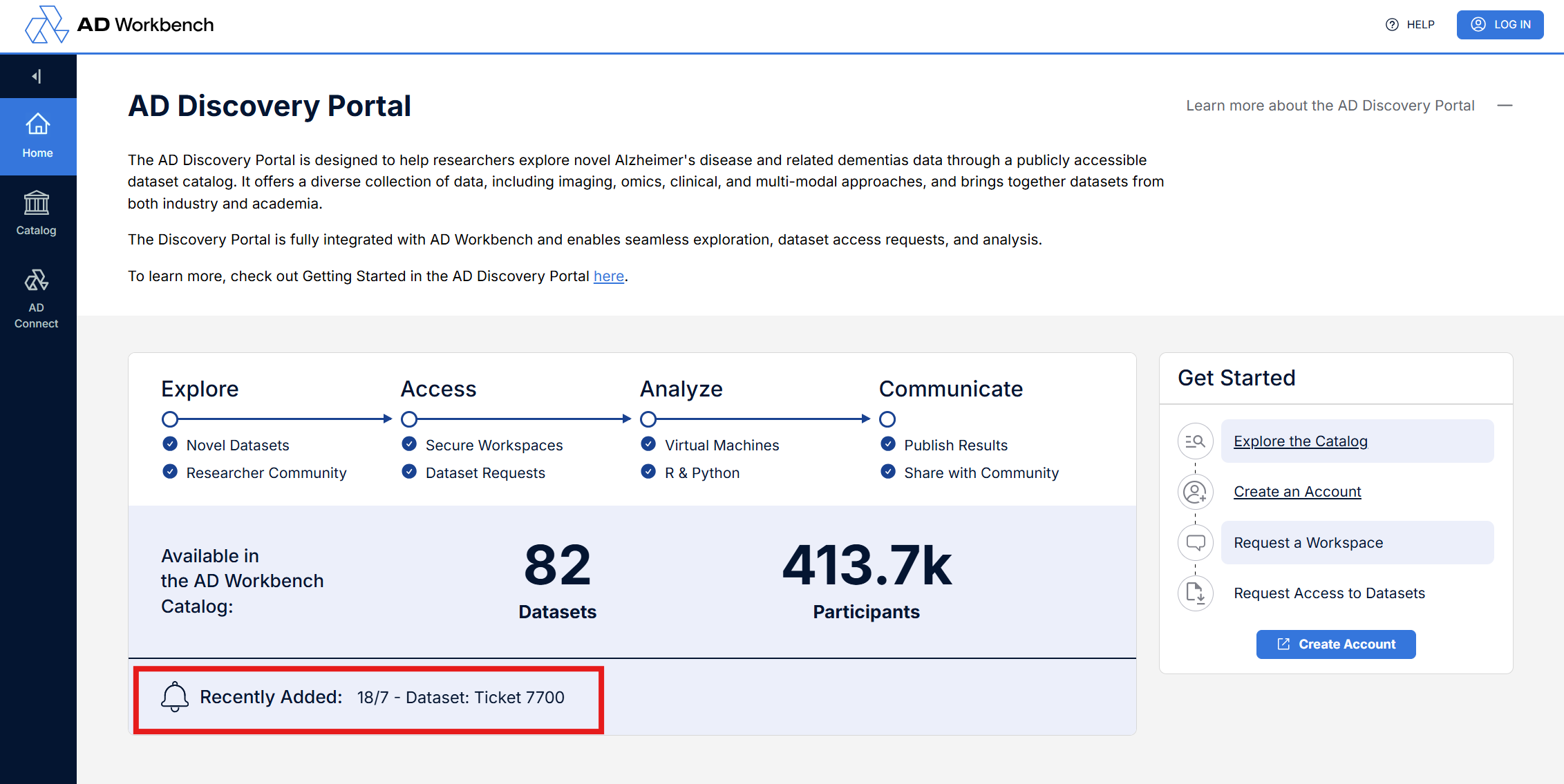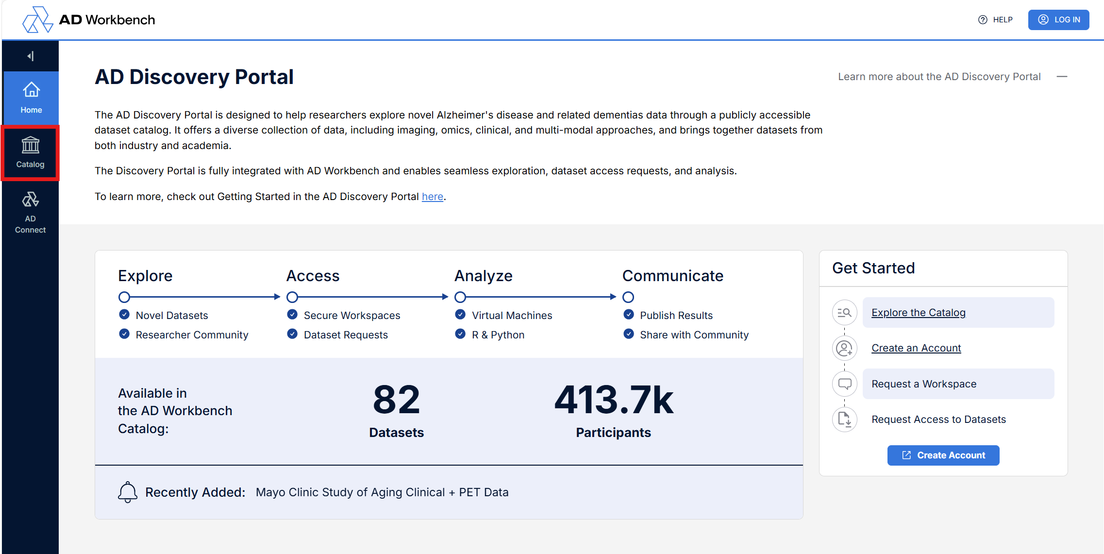 Select one of the “Recently Added” datasets scrolling in the bottom info panel to navigate to the detail page for that dataset or select the “Catalog” button in the left side bar to open the dataset search interface.