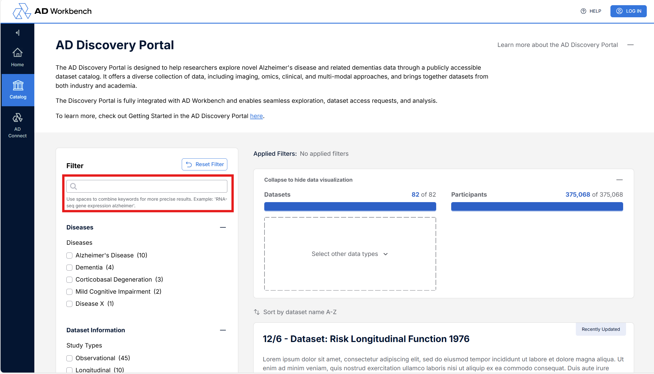 Filter for datasets using the faceted search filters on the left.