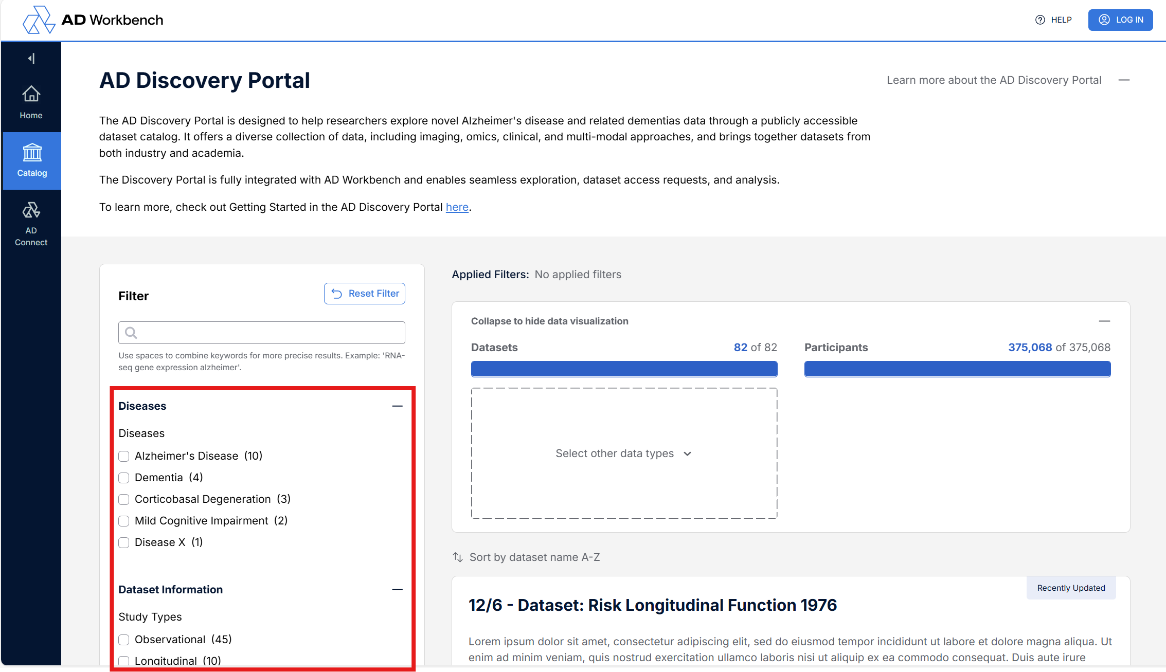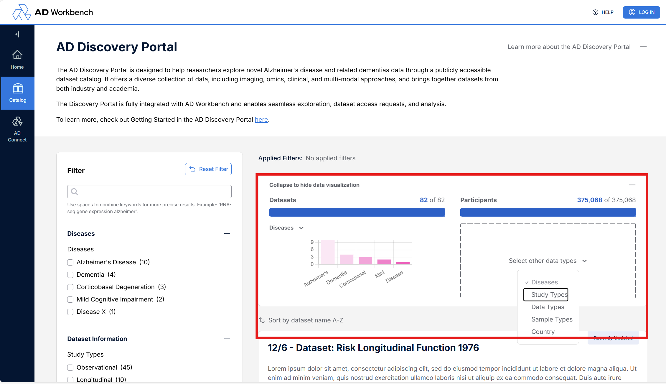 Select an option from the dropdown lists under “Datasets” and “Participants” in the top panel to render data visualizations.