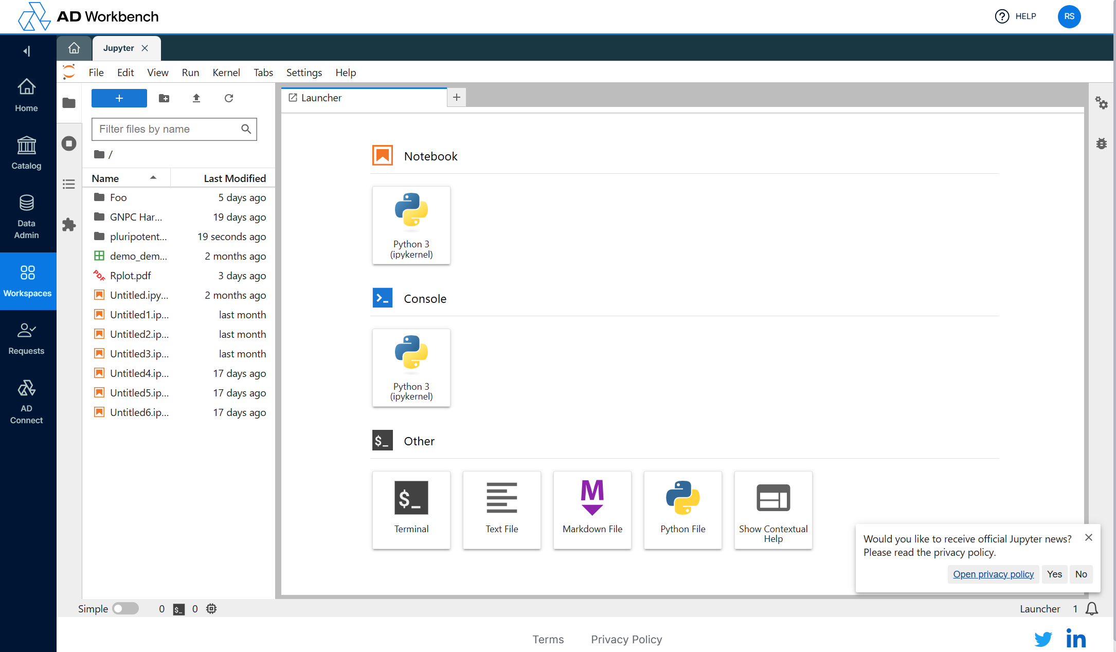 Your workspace comes equipped with Built-in Applications like RStudio, Jupyter Notebook. After your workspace request is approved, you will immediately have access to these tools.