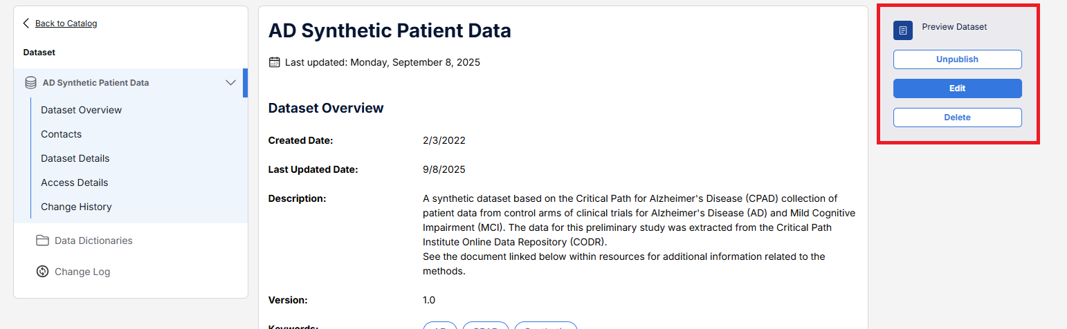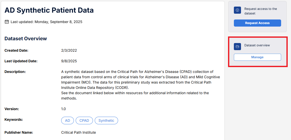 Navigate to the dataset of interest, then select Manage from the Dataset overview options on the right-hand side.