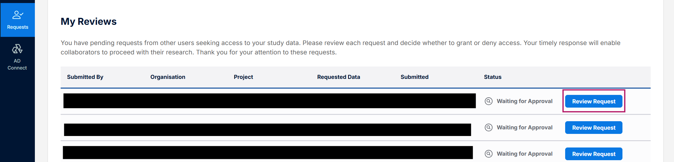 Scroll down to My Reviews to see the Data Access Requests that have been submitted for your dataset. Click on Review Request to open the Data Access Request in full and to review details.