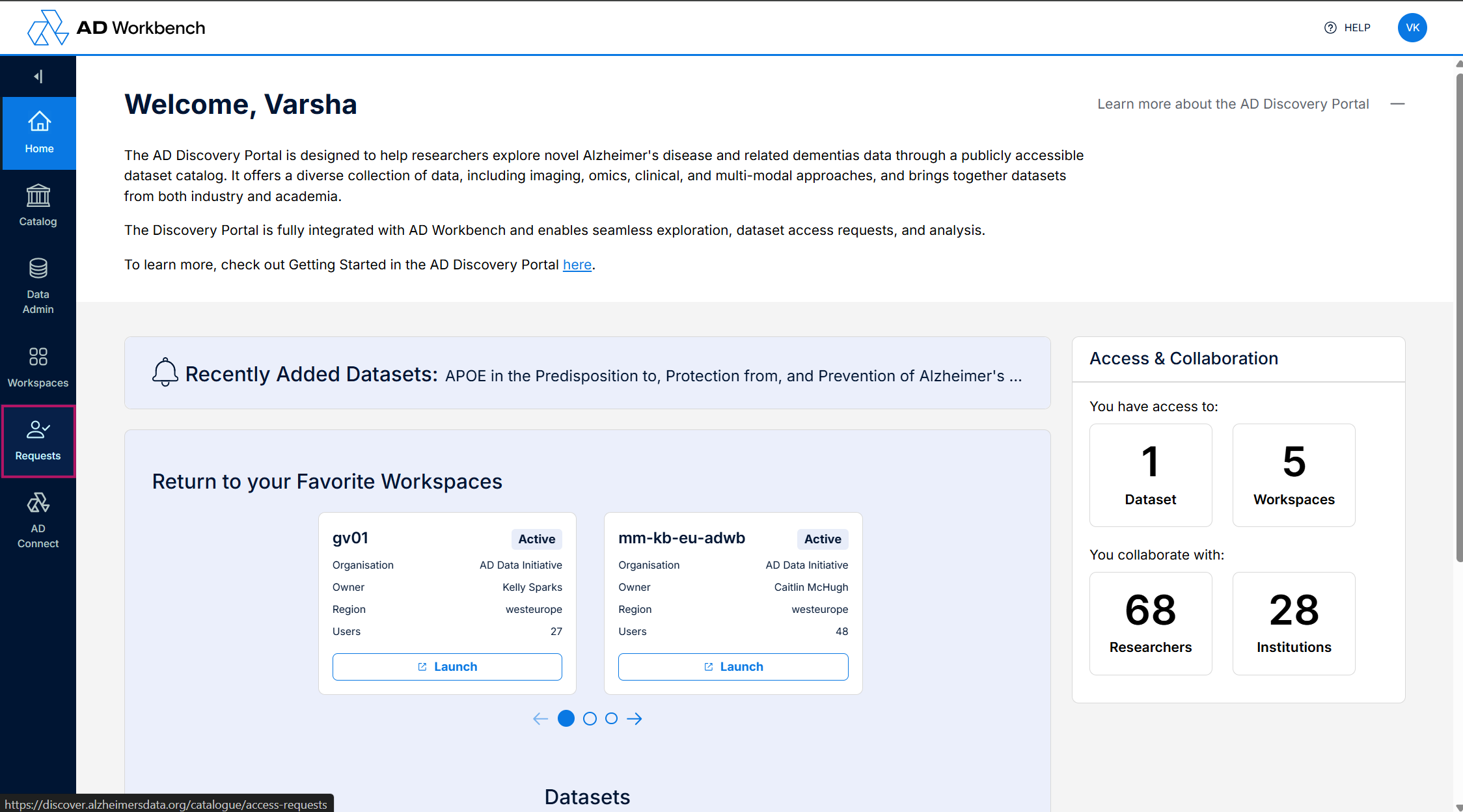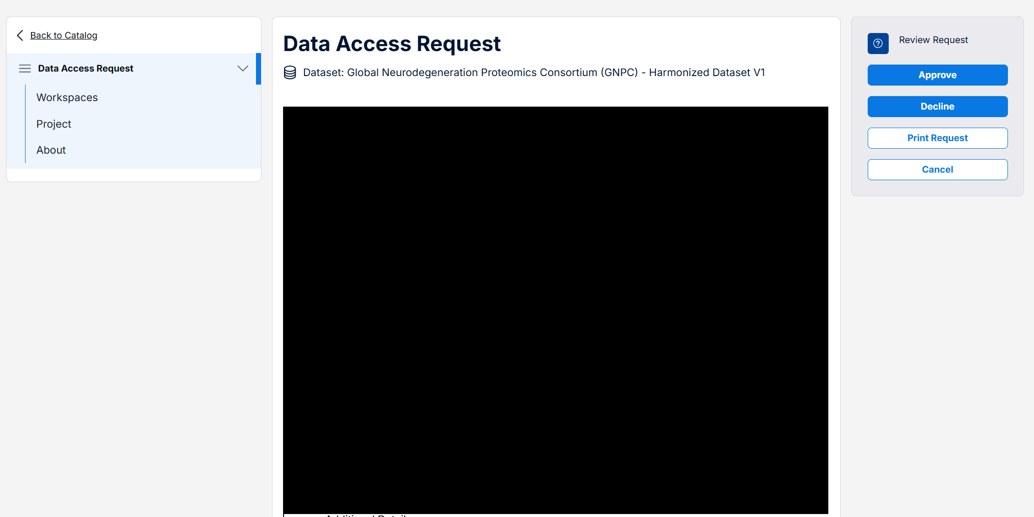 As a data owner, you will receive requests to access your dataset. Past and present access requests to be reviewed can be viewed by selecting Requests from the left-side menu.