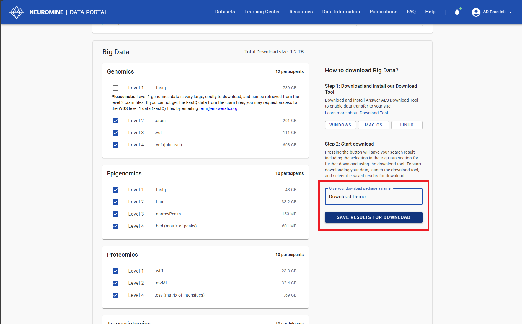 Choose which data files you’d like to download. If Big Data is included, choose the Windows or Linux option for the Download tool and install the tool. Name your download bundle and select Save Results for Download.